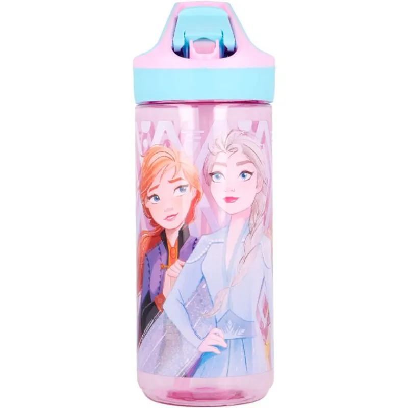 Botella fabricada en tritan, con diseños inspirados en Frozen, que dispone de un sistema de boquilla con apertura automatizada incluida en el tapón. Tiene una capacidad de 620 ml y es libre de BPA.