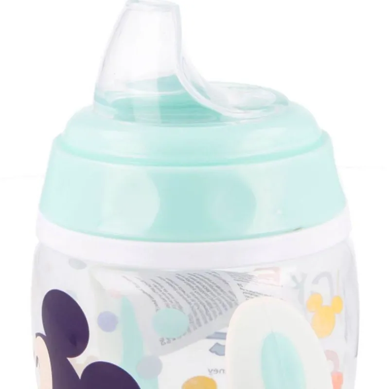 Taza de entrenamiento con diseños del ratoncito Mickey Mouse. Es especial para bebés con boquilla de silicona para que los más pequeños de la casa aprendan a beber en vaso convencional. Dispone de una capacidad de 270 ml y está libre de BPA.