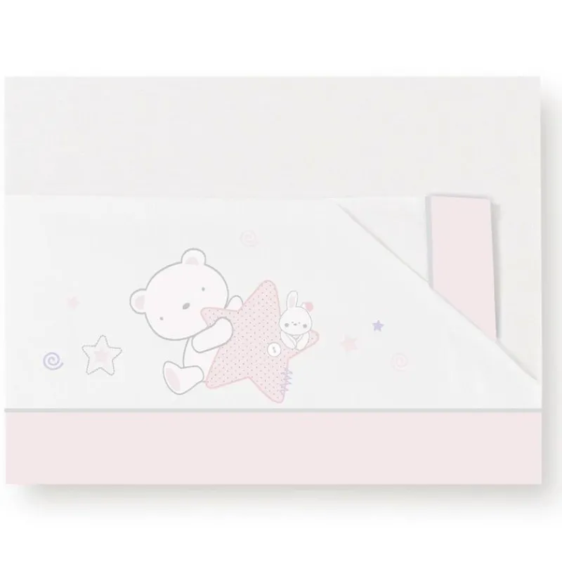 Tríptico de sábanas en algodón, con la bajera en color liso, mientras que la sábana encimera muestra un divertido estampado