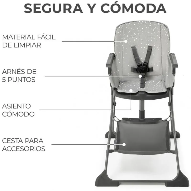Con cesta para poder guardar el babero y accesorios del bebe.