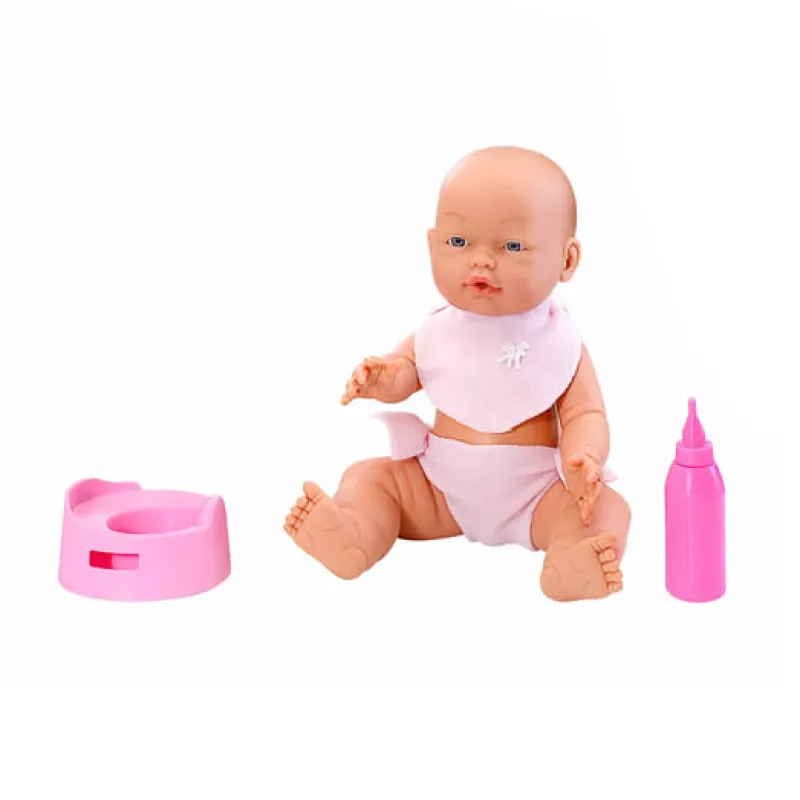 Nuevo muñeco bebé de 35 Cm. Vestido solo con un babero y un pañal básico, toma el biberón y hace pipi. Incluye un biberón y un orinal. Funciona sin pilas.