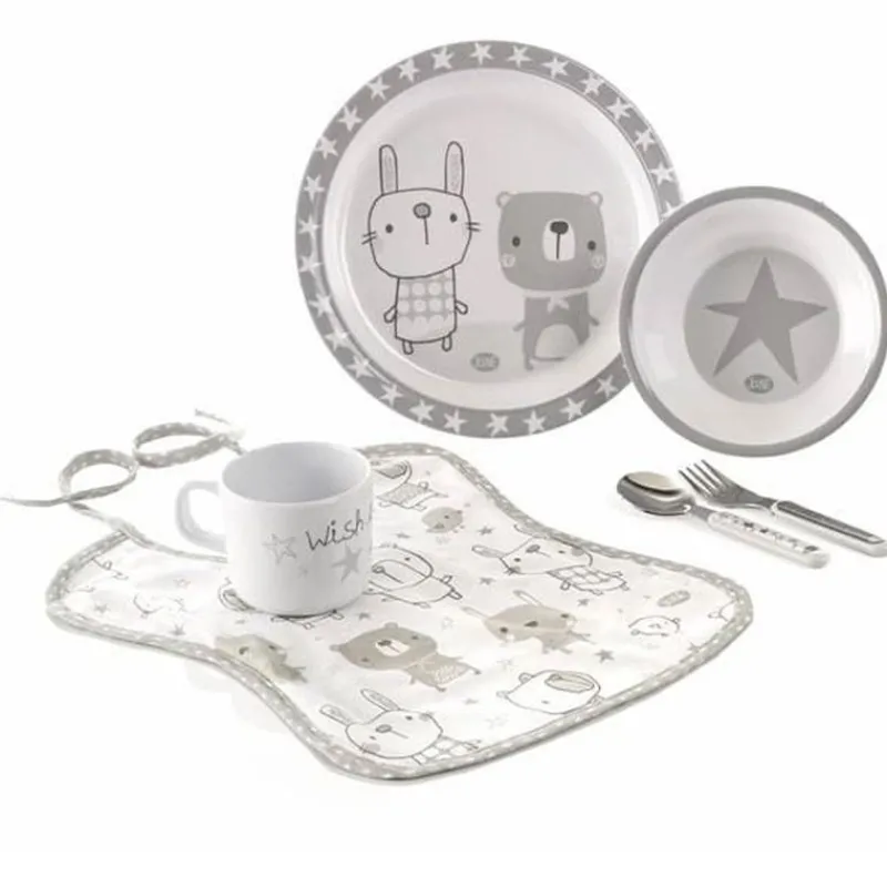 Consta de: 1 plato, 1 bol, 1 cuchara, 1 tenedor y 1 taza con asa y un babero.