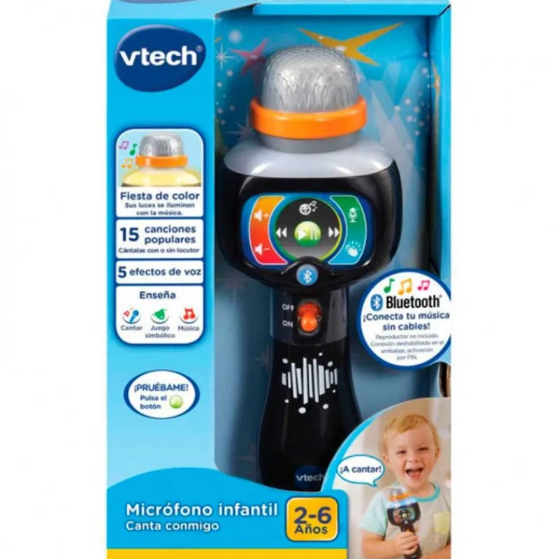 Micrófono infantil con el que los más pequeños de la casa podrán aprender canciones populares ¡Conecta tu reproductor musical de manera inalámbrica o descubre las canciones incluidas! Dispone de Bluetooth para poder cantar las canciones que tú quieras (activación por PIN) 15 canciones incluidas, efectos de voz, fiesta de color con luces que se iluminan con la música. El micrófono tiene unas dimensiones de 21.2 cm x 8.3 cm x 5.6 cm aproximadamente. Funciona con 3 pilas AAA incluidas (pilas de demostración). Recomendado a partir de 2 años.